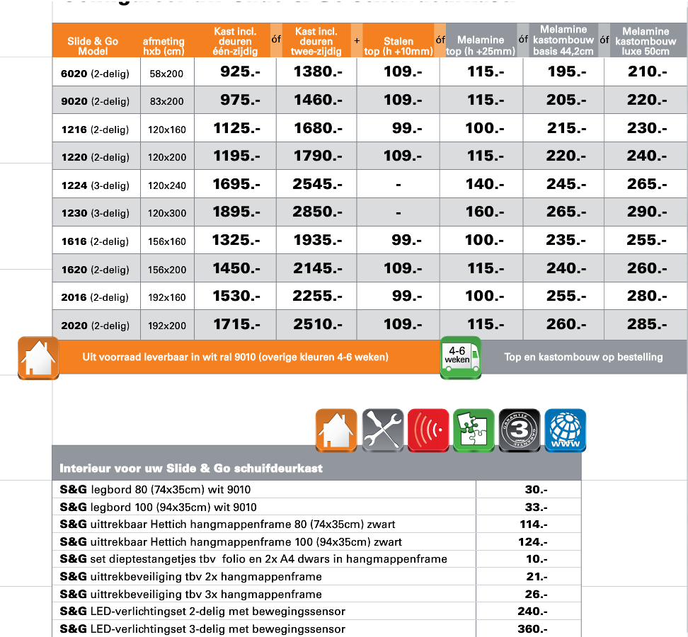 Prijzen in tabel: geldig voor kast incl. deuren één-zijdig zonder top / ombouw
