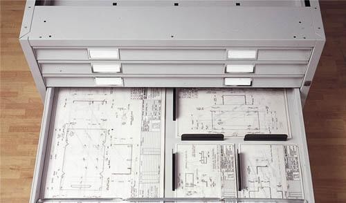 Bisley tekeningkasten zijn flexibel in te richten en zorgen voor een veilige opslag van uw grotere documenten. Tekeningkasten zijn leverbaar in secties van 5 laden zowel op A0 als A1 formaat (maximaal 3 secties van 5 laden op elkaar plaatsen!). Elke lade is voorzien van een papieraandrukstang en aan de achterzijde van een teruggebogen rand zodat documenten niet kunnen beschadigen. Optioneel kunt u kiezen voor ladeverdelers om een lade in te delen in A1, A2, A3 of A4 formaat. Voor A1 formaat heeft u 2 verdelers nodig, voor A2 6, voor A3 10 en voor A4 18.